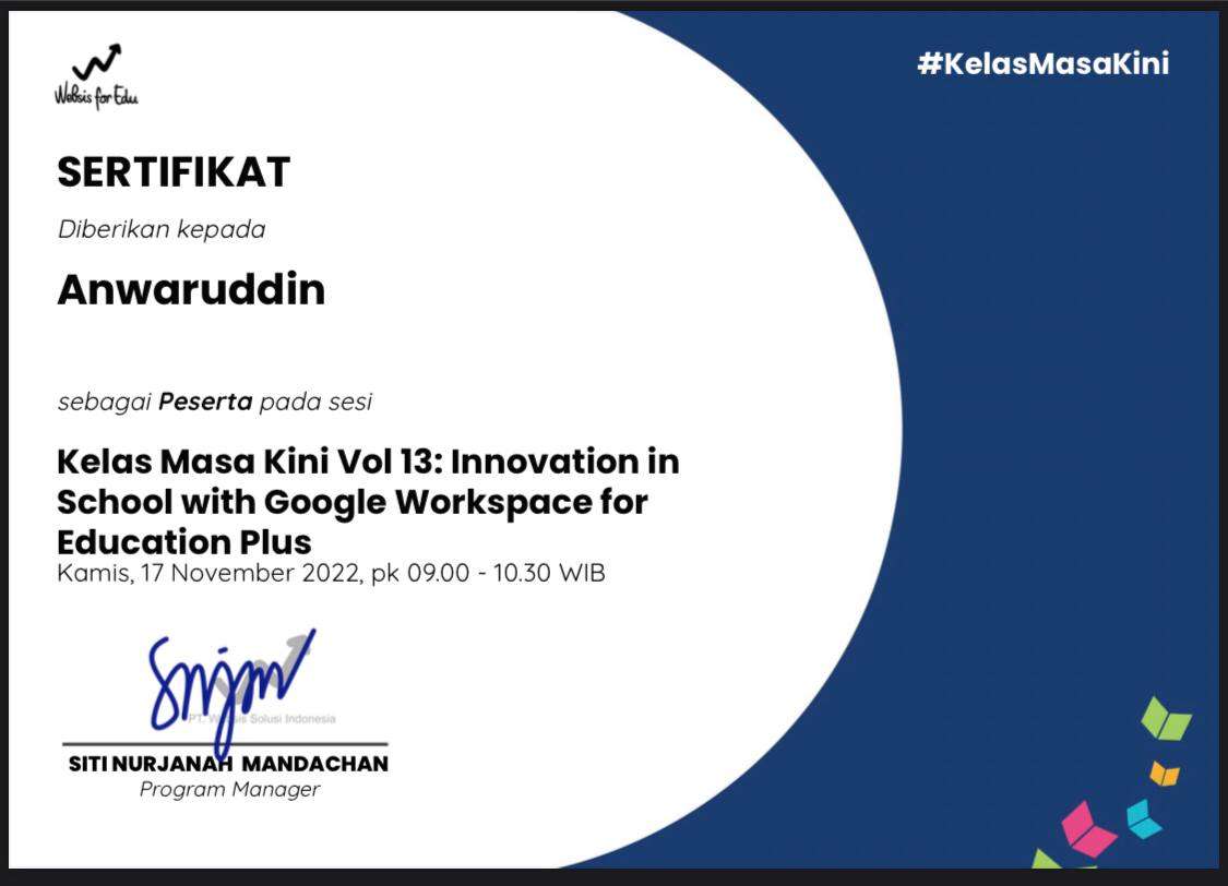 Mendapatkan Sertifikat dari Websis For Edu sebagai Peserta Kelas Masa Kini Vol 13 : Innovation in School With Google Workspace For Education Plus