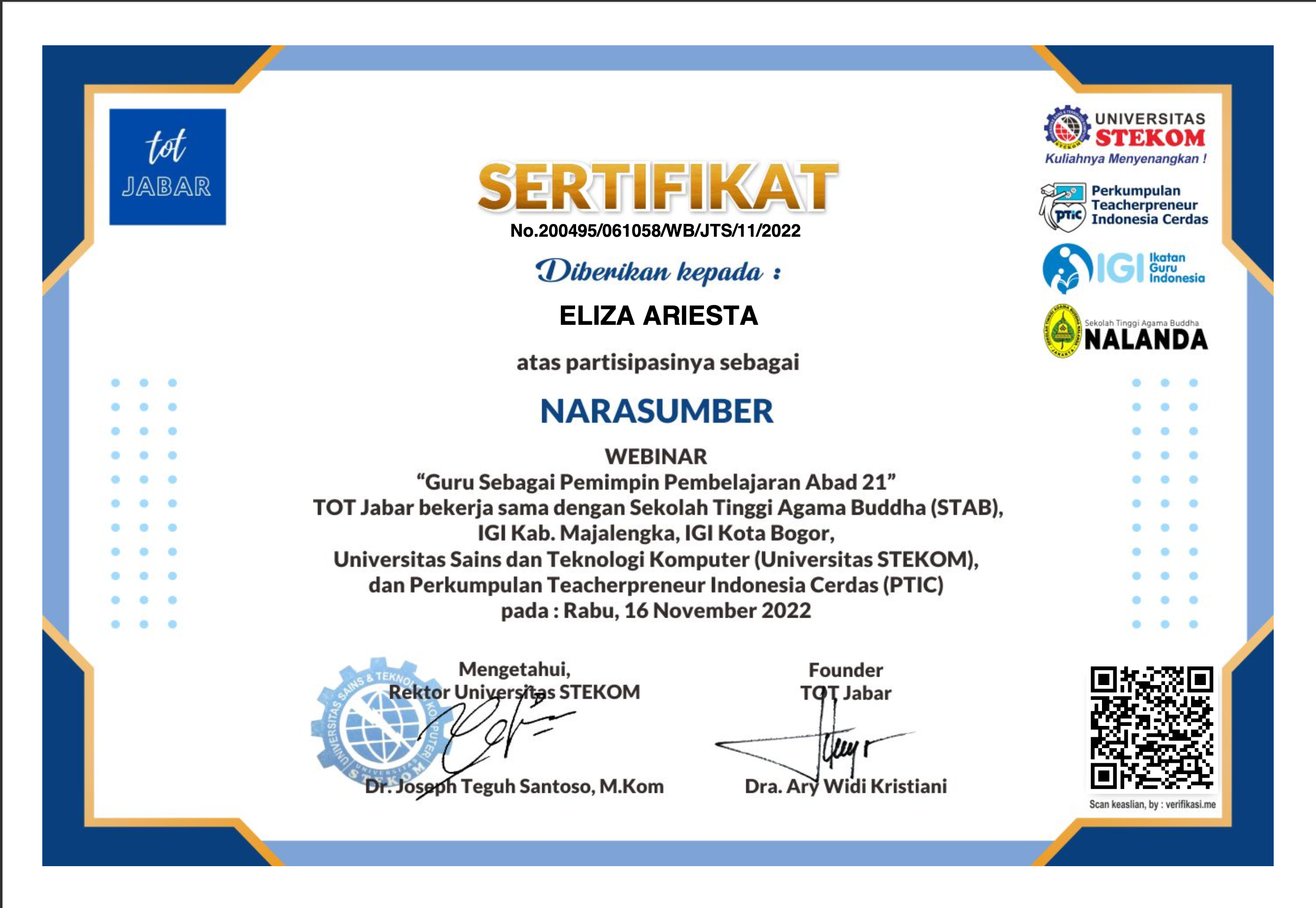 Narasumber Webinar "Guru Sebagai Pemimpin Pembelajaran Abad 21" yang diselenggarakan oleh ToT Jabar bekerjsama dengan Sekolah Tinggi Agama Buddha (STAB) IGI Kab. Majalengka, IGI Kota Bogor, Universitas Sains dan Teknologi Komputer (Universitas STEKOM), dan Perkumpulan Teacherpreneur Indonesia Cerdas (PTIC)