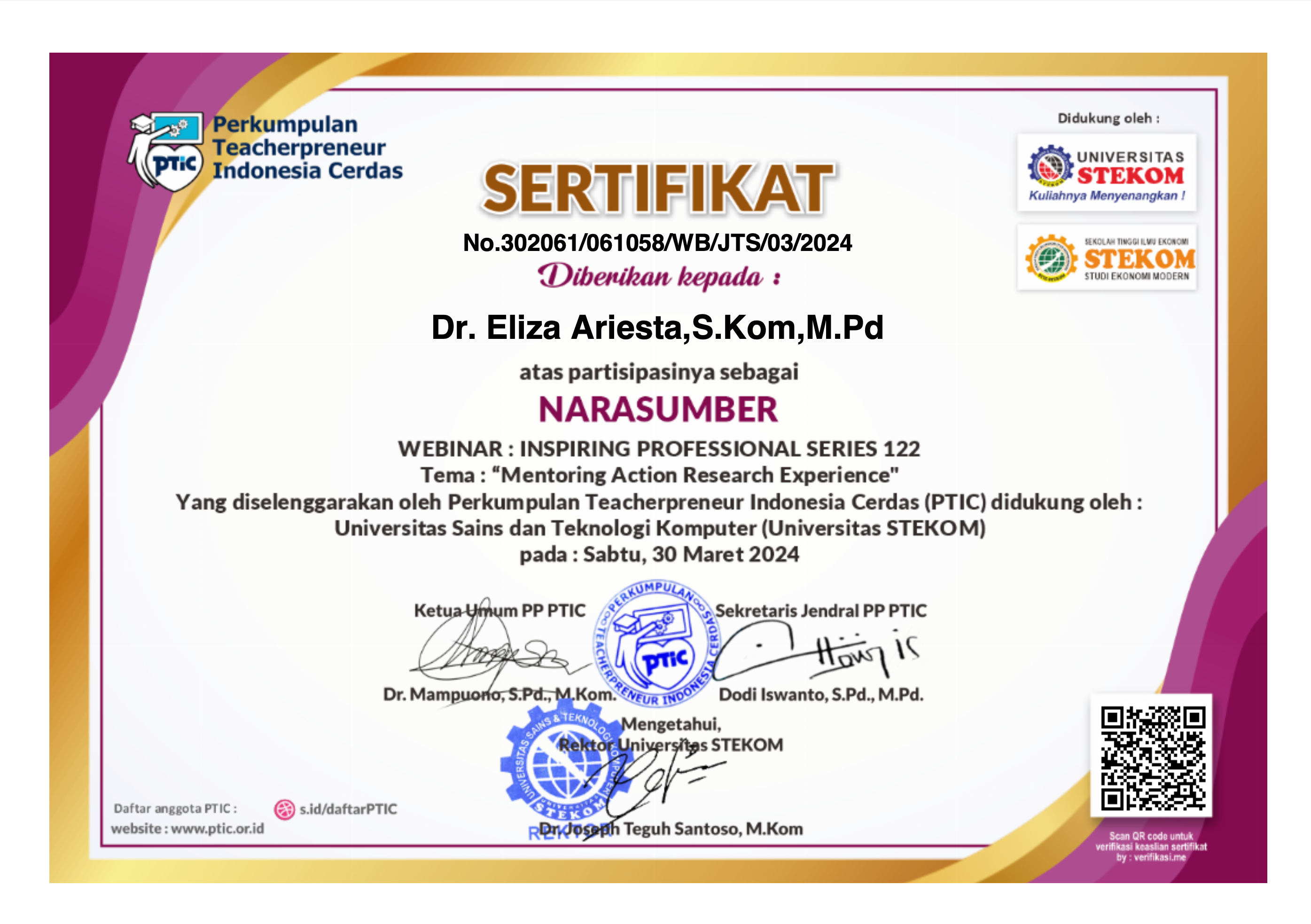 Narasumber Webinar : Inspiring Professional Series 122 "Mentoring Action Research Experience" yang diselenggarakan Teacherpreneur Indonesia Cerdas (PTIC).